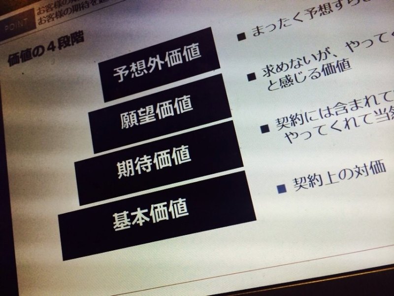まず、はじめは「基本価値」。これは、契約の対価であり、約束通りに商品を納品するというもの。次は「期待価値」。契約には含まれていないものの、当たり前のこととして期待するサービス。適切な情報を提供する、しっかりとアフターフォローをするというもの。次にあるのが、「願望価値」。期待することは難しいけど、あれば嬉しい、そんな願望をかなえるサービス。商品を納品後に効果的な活用法の勉強会をしてくれるなどがそれにたたります。