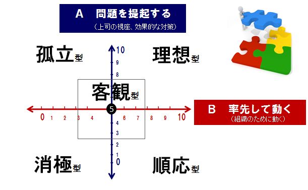 このように、「問題への提言力を高める」×「組織のために率先して動く」の2軸を高めることで、理想のフォロワーを目指すというものです。そして、コンディションに応じて「理想(参謀のような部下)」「順応(イエスマン)」「孤立(言うだけ)」「消極(指示を待つ)」「客観(バランスを見過ぎ)」に分かれます。