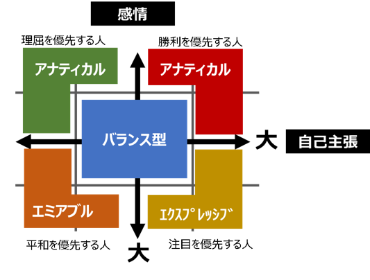 「感情」「自己主張」の大小に分け、5つのタイプに分類されます。では各タイプの特性を解説しましょう。